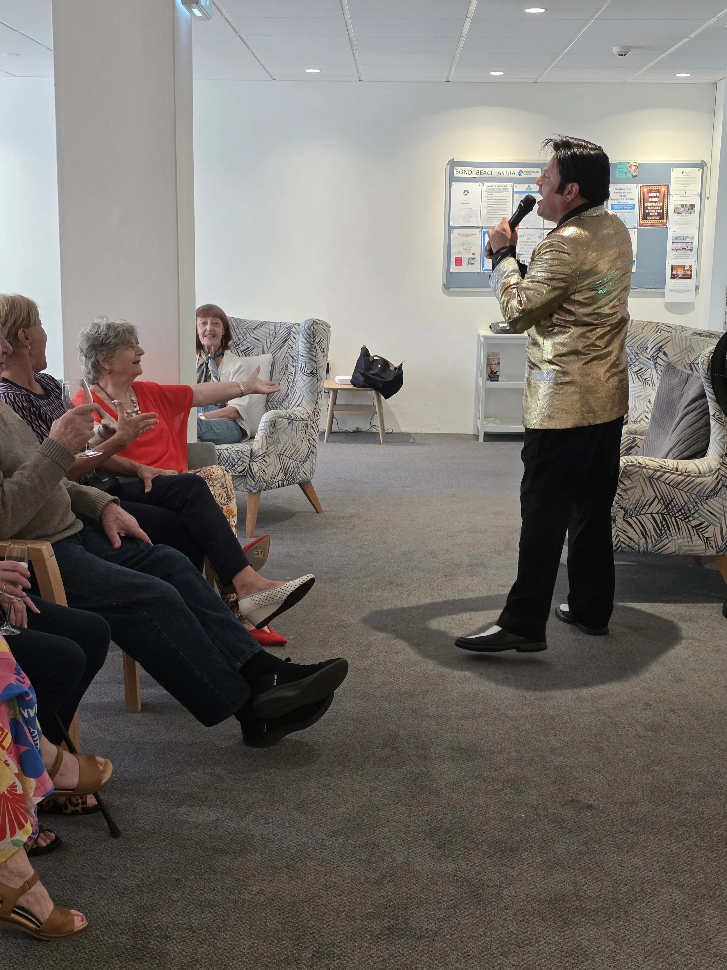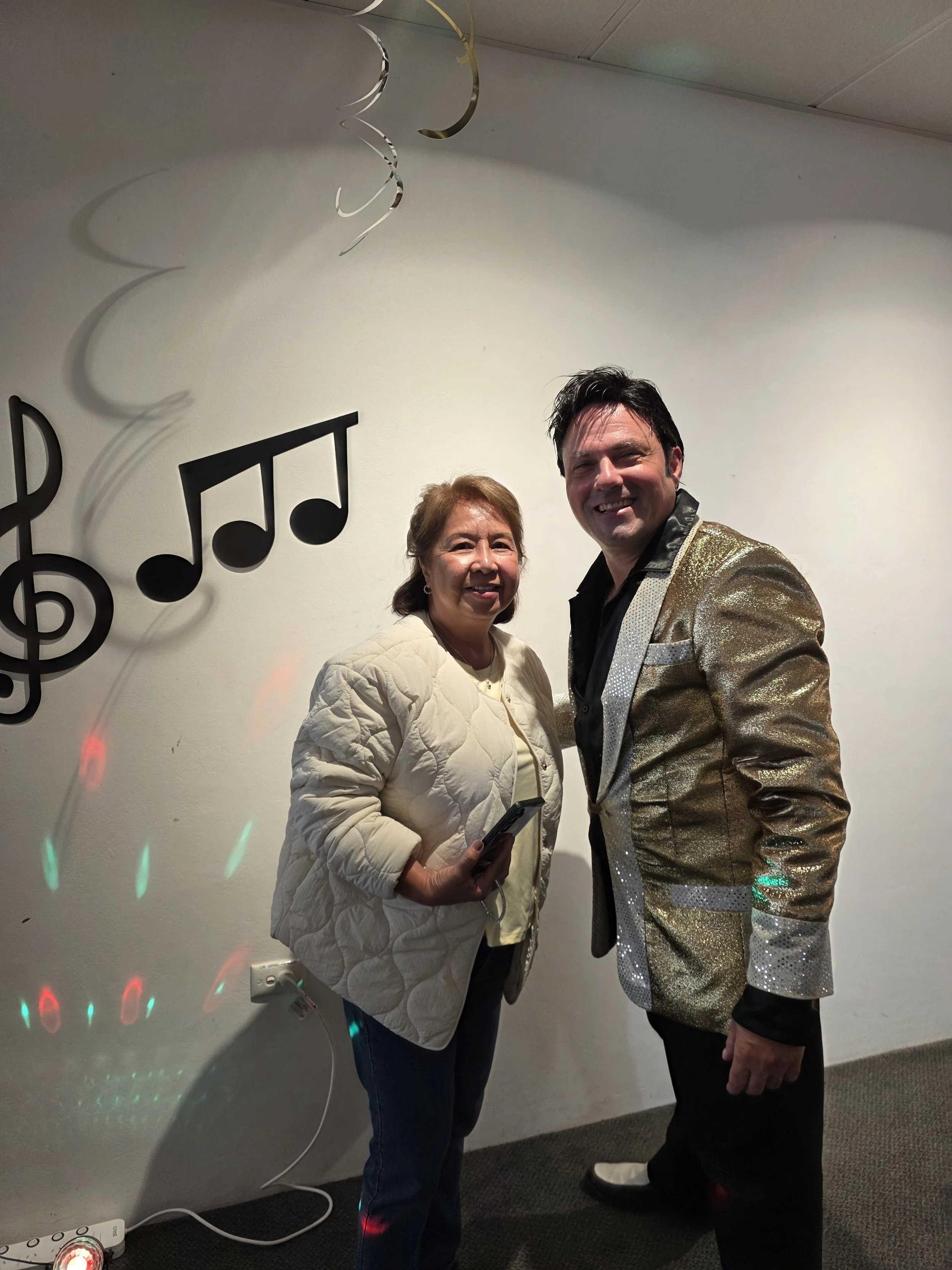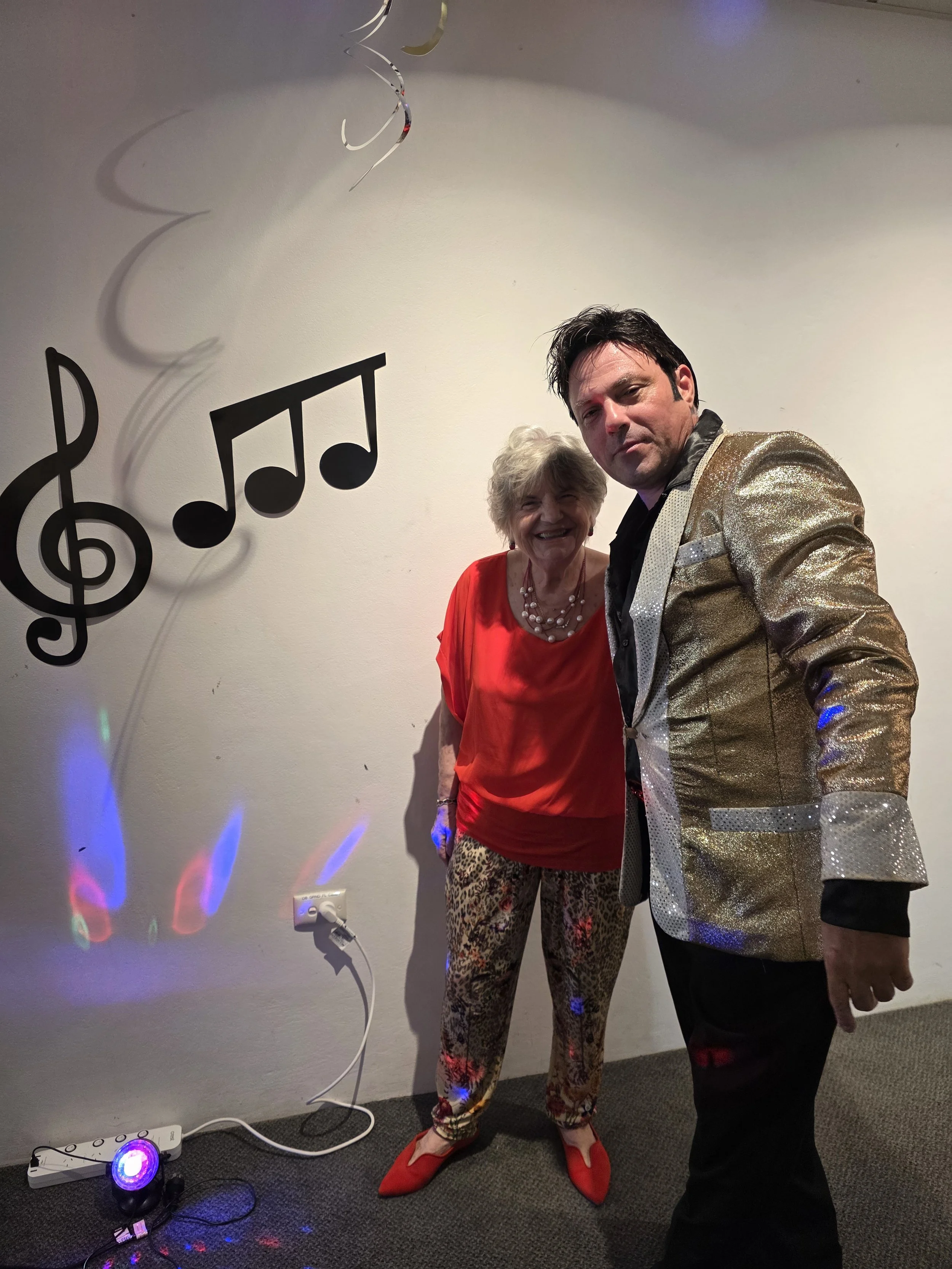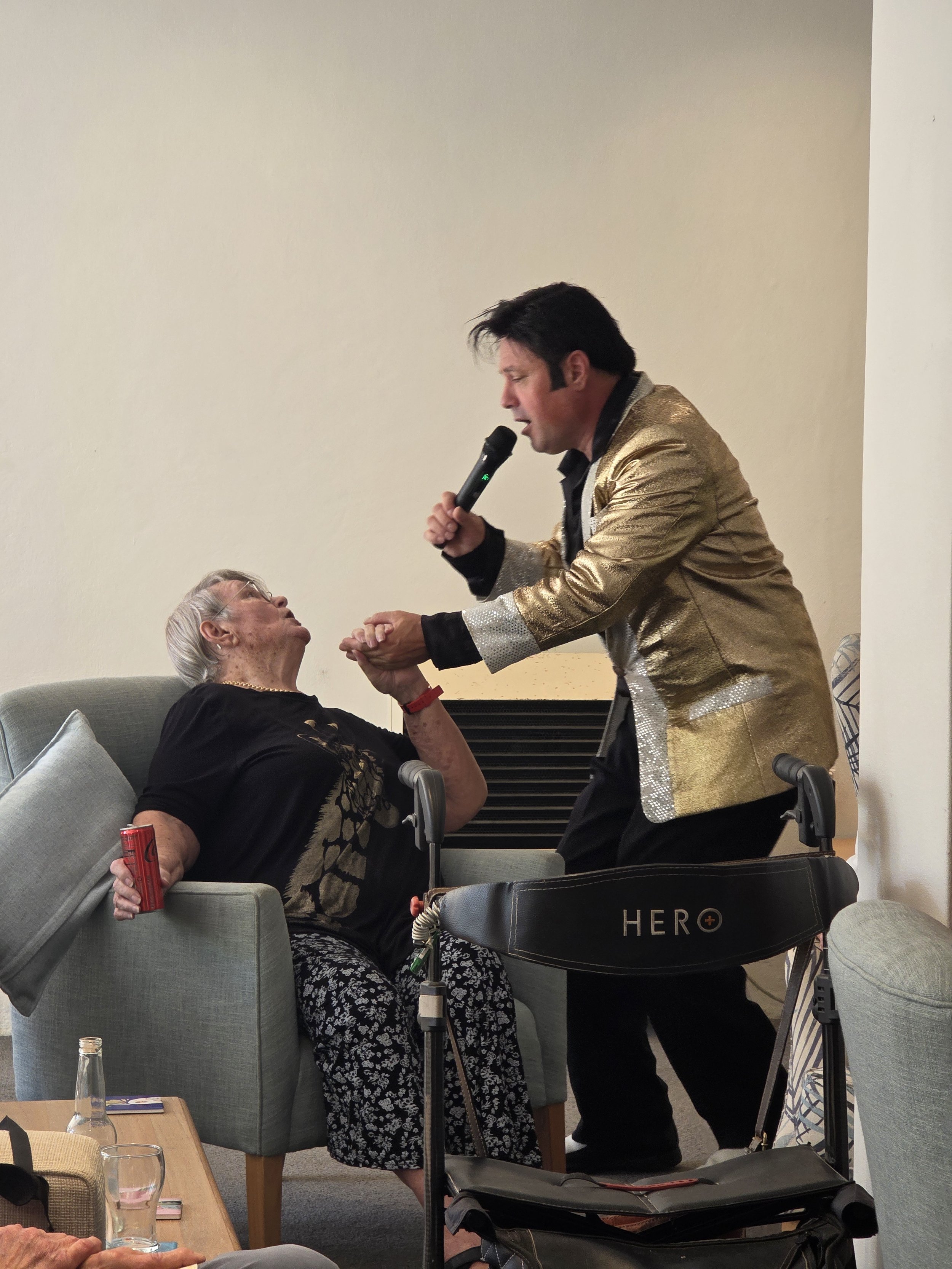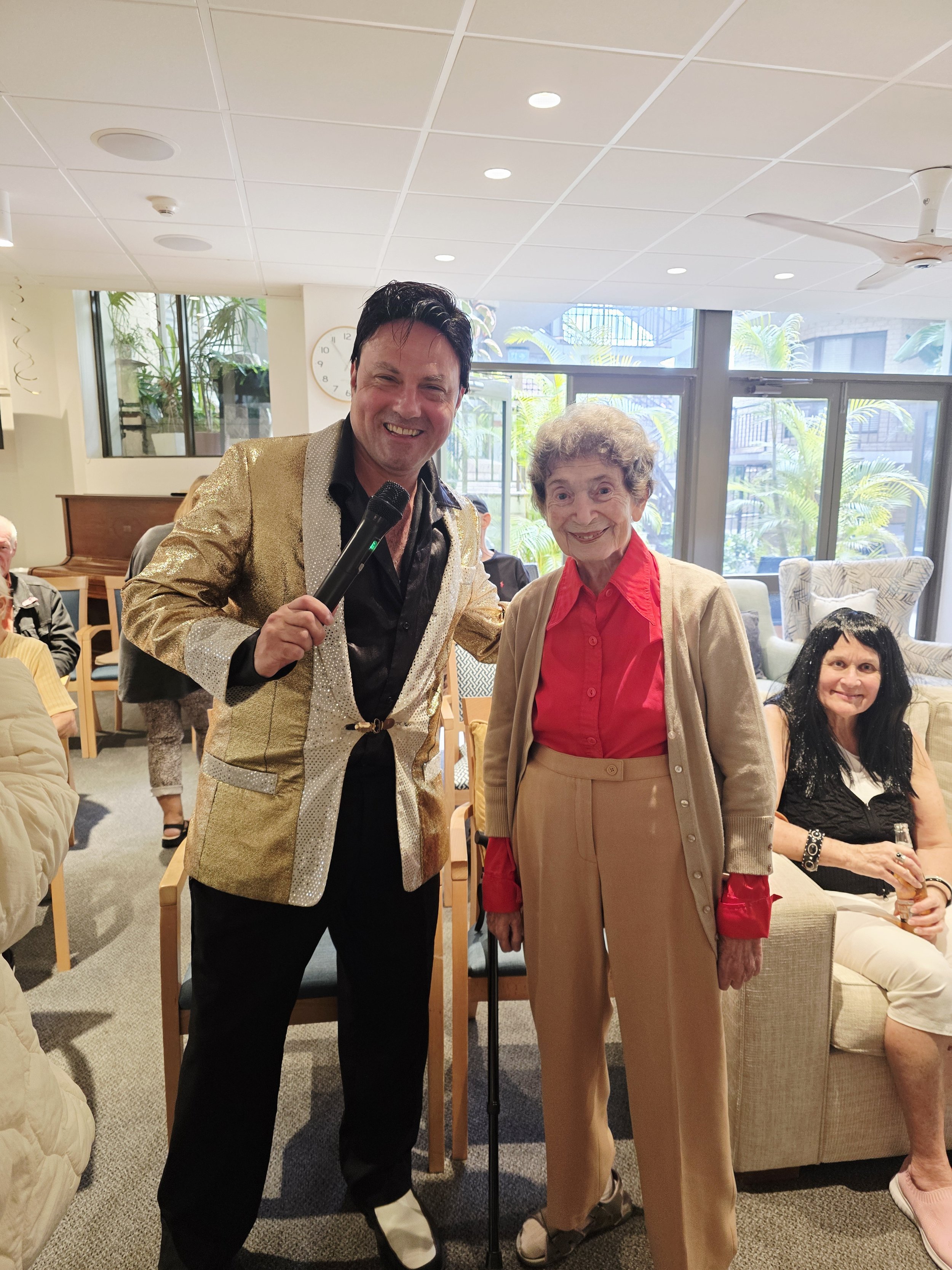 /Elvis was in the building! Award-winning performer Mike Valentine brought the King to life at the Astra, delivering a lively afternoon filled with singing, dancing, and plenty of fun. Residents were soon clapping and singing along to classics like Jailhouse Rock, In the Ghetto, and I’m So Lonesome I Could Cry. One of the standout moments came when our very own “Priscilla Presley” joined Elvis on the floor for a spontaneous dance, much to everyone’s delight. The show wrapped up on a high, with Elvis sticking around for photos and even enjoying a slice of pizza, kindly provided by the Tratt. A big thank you to Mike for such an entertaining performance, and to the Tratt for keeping everyone well fed. We hear Mike also has a repertoire of other famous crooners—so we’re already looking forward to his next visit!