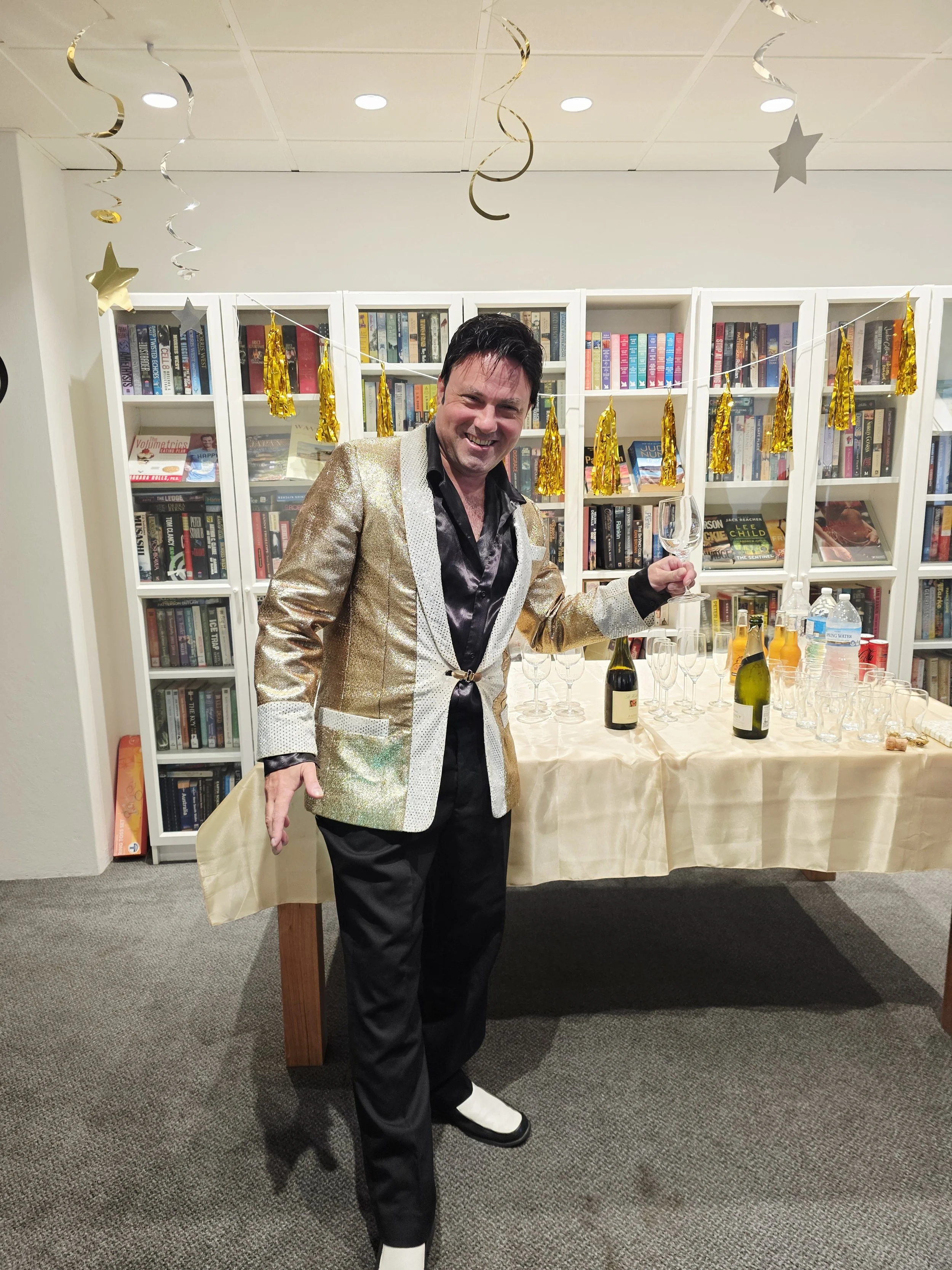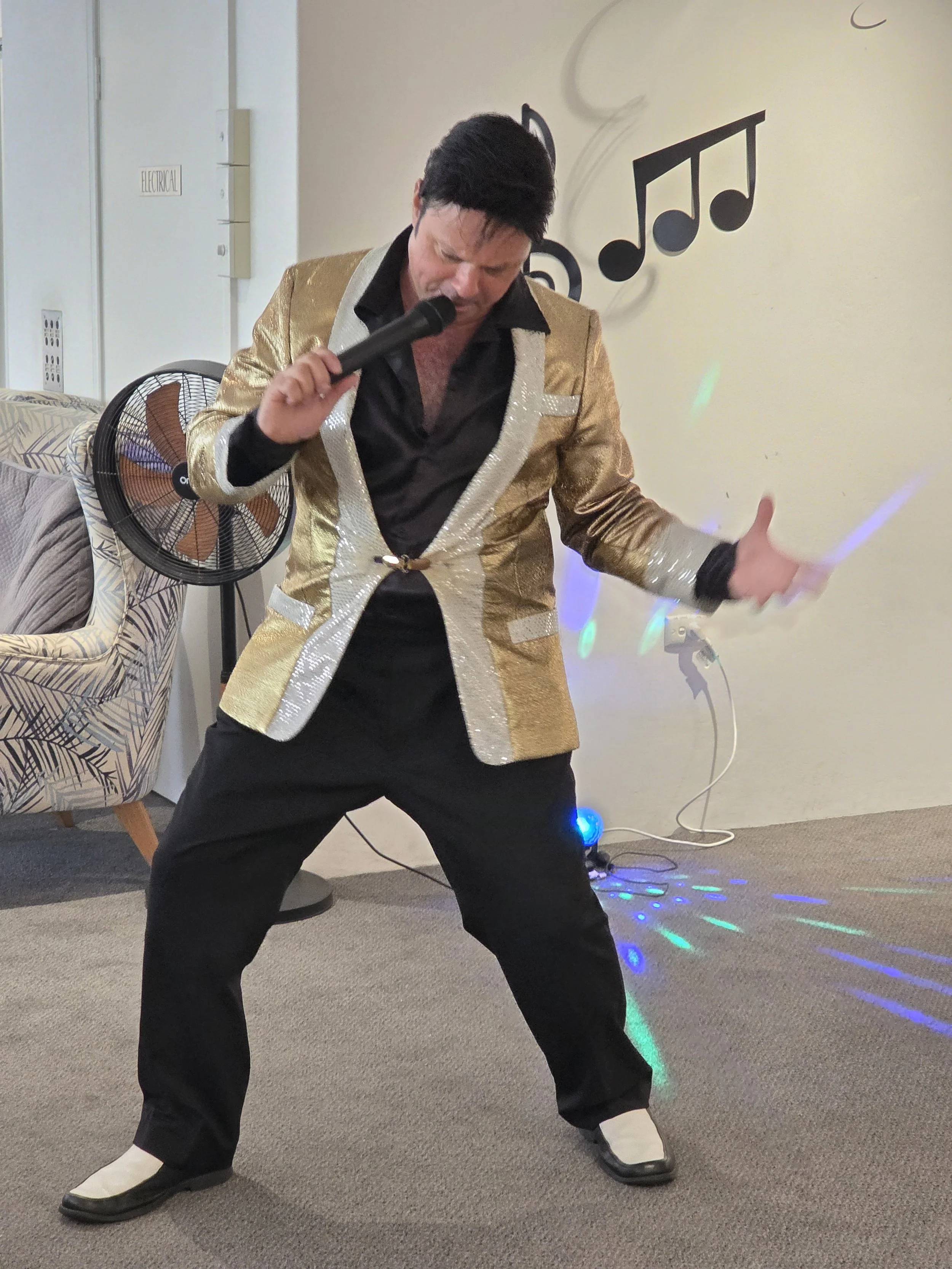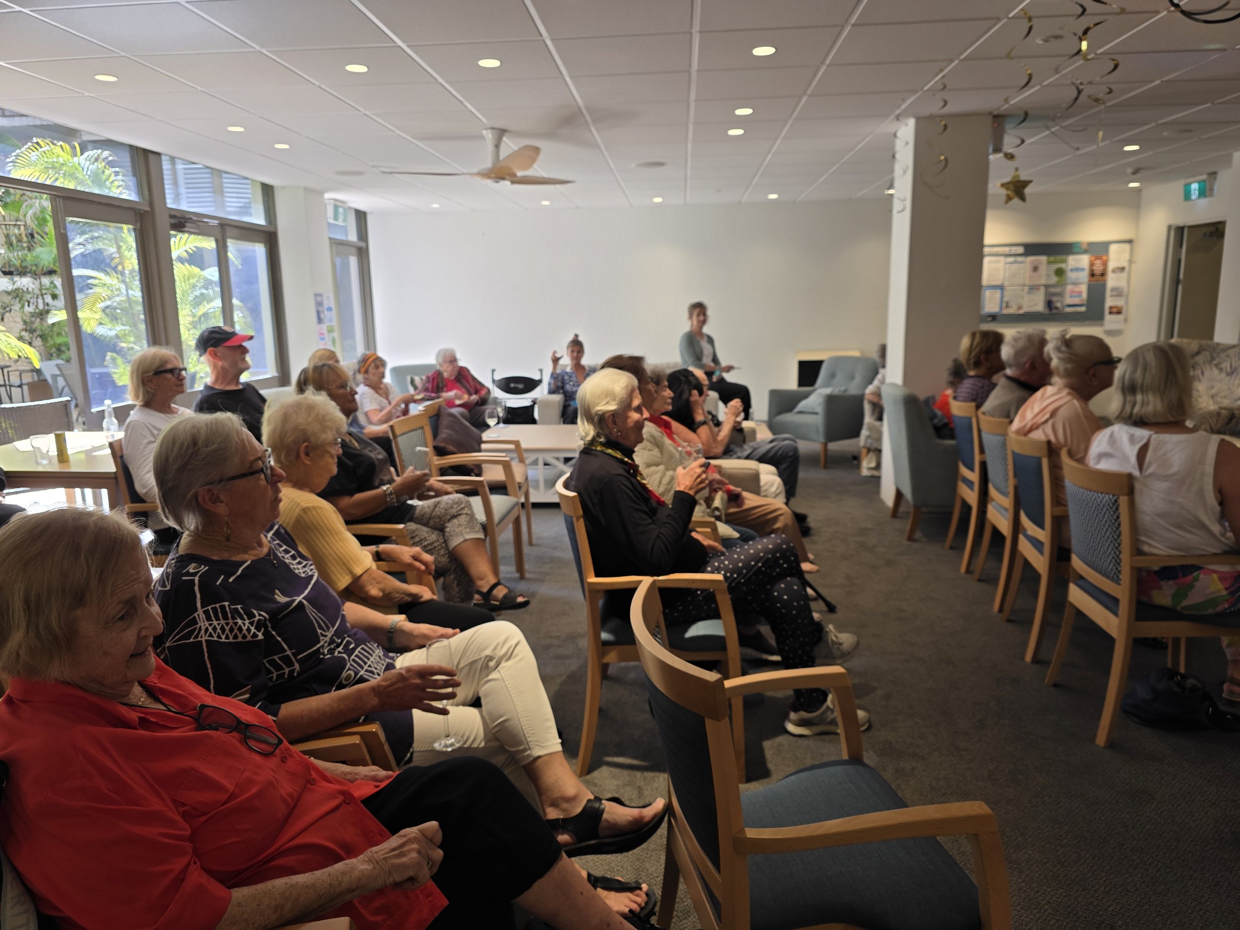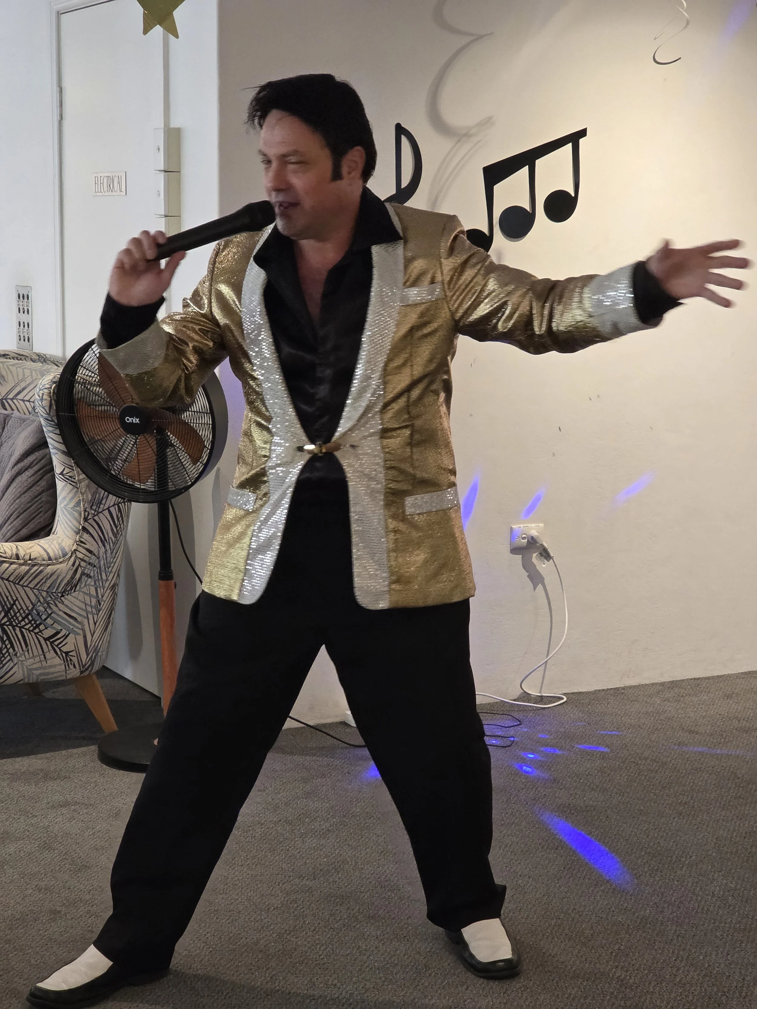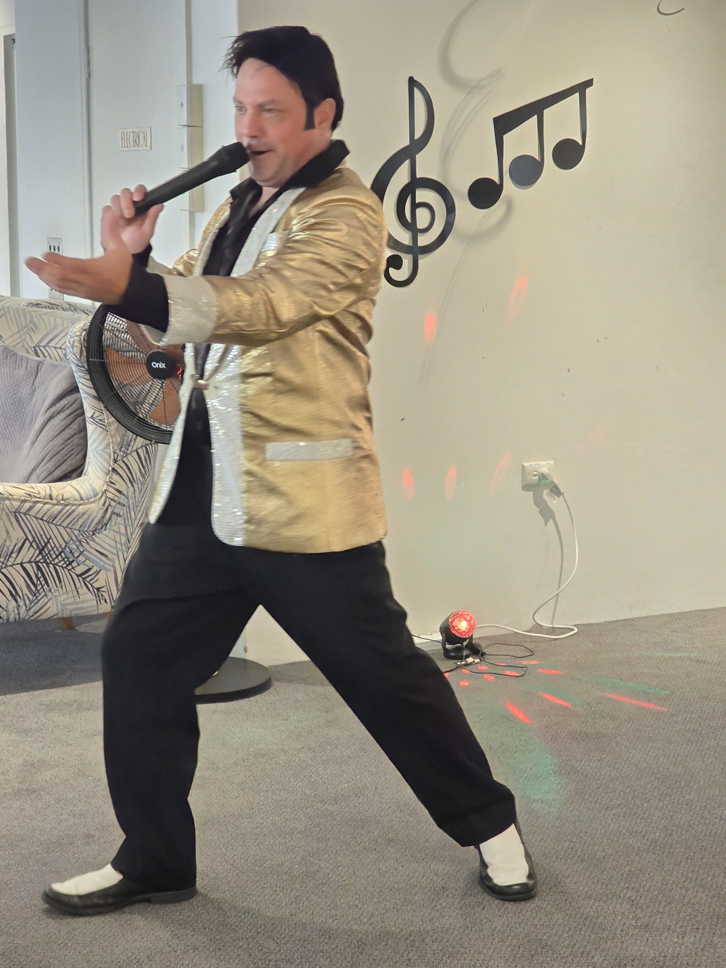 /Elvis was in the building! Award-winning performer Mike Valentine brought the King to life at the Astra, delivering a lively afternoon filled with singing, dancing, and plenty of fun. Residents were soon clapping and singing along to classics like Jailhouse Rock, In the Ghetto, and I’m So Lonesome I Could Cry. One of the standout moments came when our very own “Priscilla Presley” joined Elvis on the floor for a spontaneous dance, much to everyone’s delight. The show wrapped up on a high, with Elvis sticking around for photos and even enjoying a slice of pizza, kindly provided by the Tratt. A big thank you to Mike for such an entertaining performance, and to the Tratt for keeping everyone well fed. We hear Mike also has a repertoire of other famous crooners—so we’re already looking forward to his next visit!